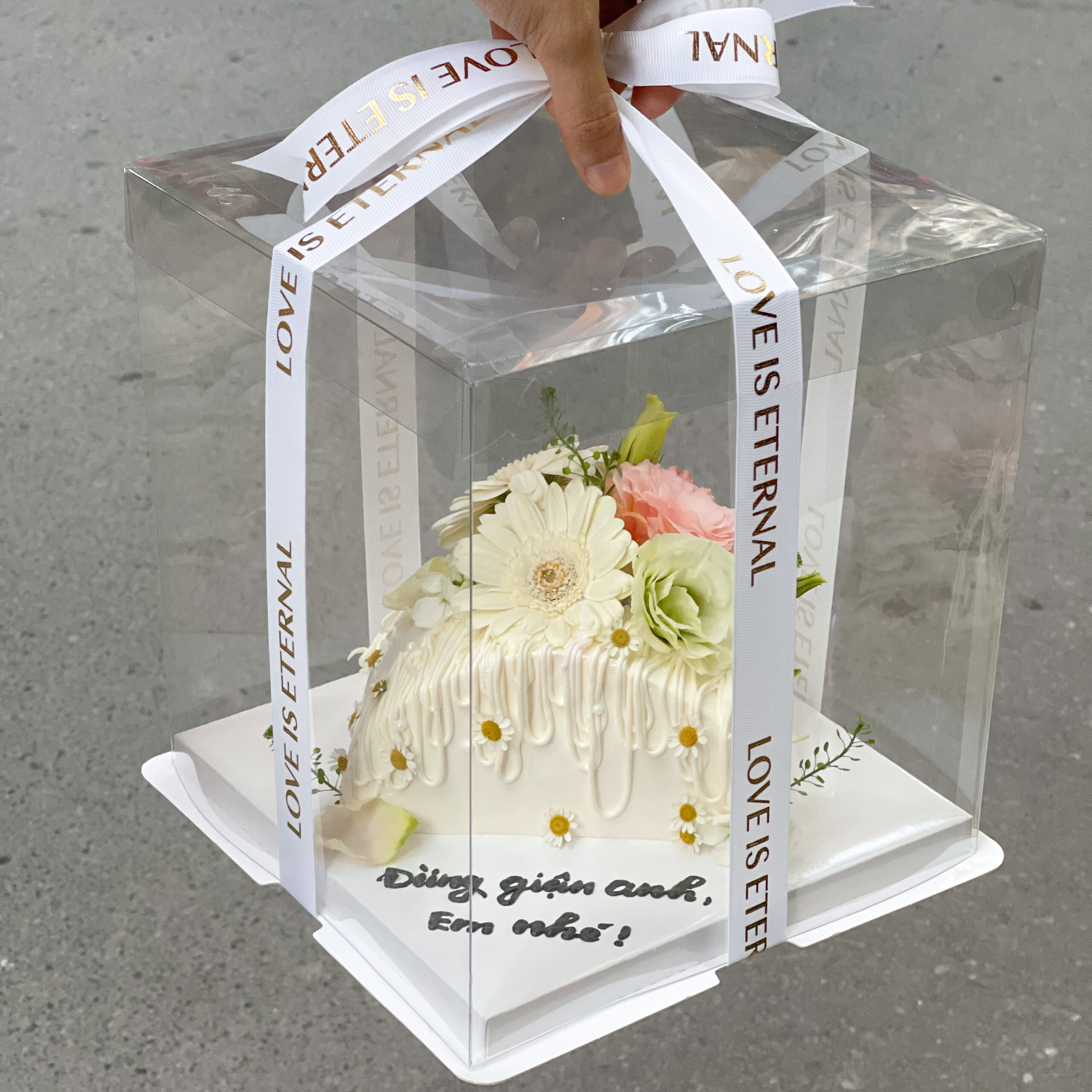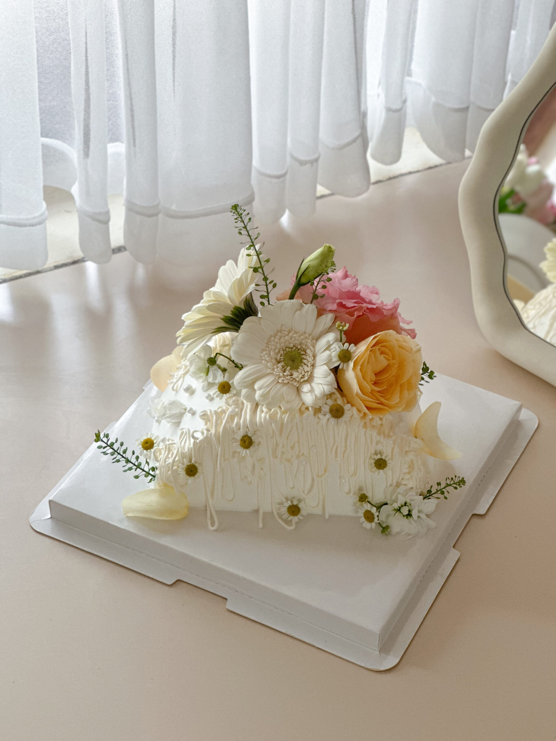 Floral Cakes là kết hợp sáng tạo giữa hoa tươi và bánh ngọt thanh lịch, sang trọng, phù hợp làm quà tặng trong những dịp đặc biệt. Bánh được thiết kế theo bán nguyệt lạ mắt, màu trắng tinh tế cùng hương vị xoài “best-seller”.